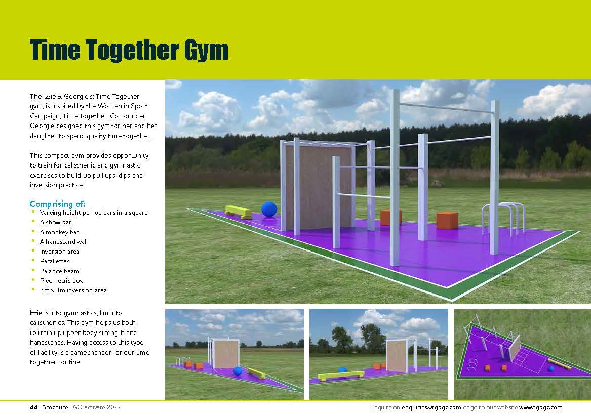 The Izzie & Georgie's: Time Together Gym, is inspired by the Women in Sport Campaign, Time Together, Co Founded Georgie designed this gym for her and her daughter to spend quality time together. This compact gym provides opportunity to train for calisthenic and gymnastic exercises to build up pull ups, dips and inversion practice.